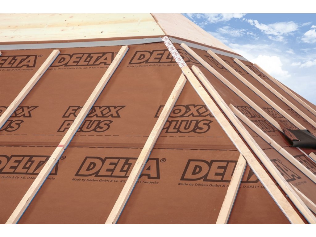 DELTA®-FOXX PLUS splňuje požadavky Pravidel německého Cechu pokrývačů (ZVDH-Regelwerk) a lze ji použít společně se systémovými prvky i jako dočasné zastřešení. Tím je střešní konstrukce po dobu dalších prací dočasně chráněna před vlhkostí a účinky povětrnosti. Lze tak např. dále pracovat v půdním prostoru. - Vybavena technologiemi DELTA®-AMS a DELTA®-BiCo.