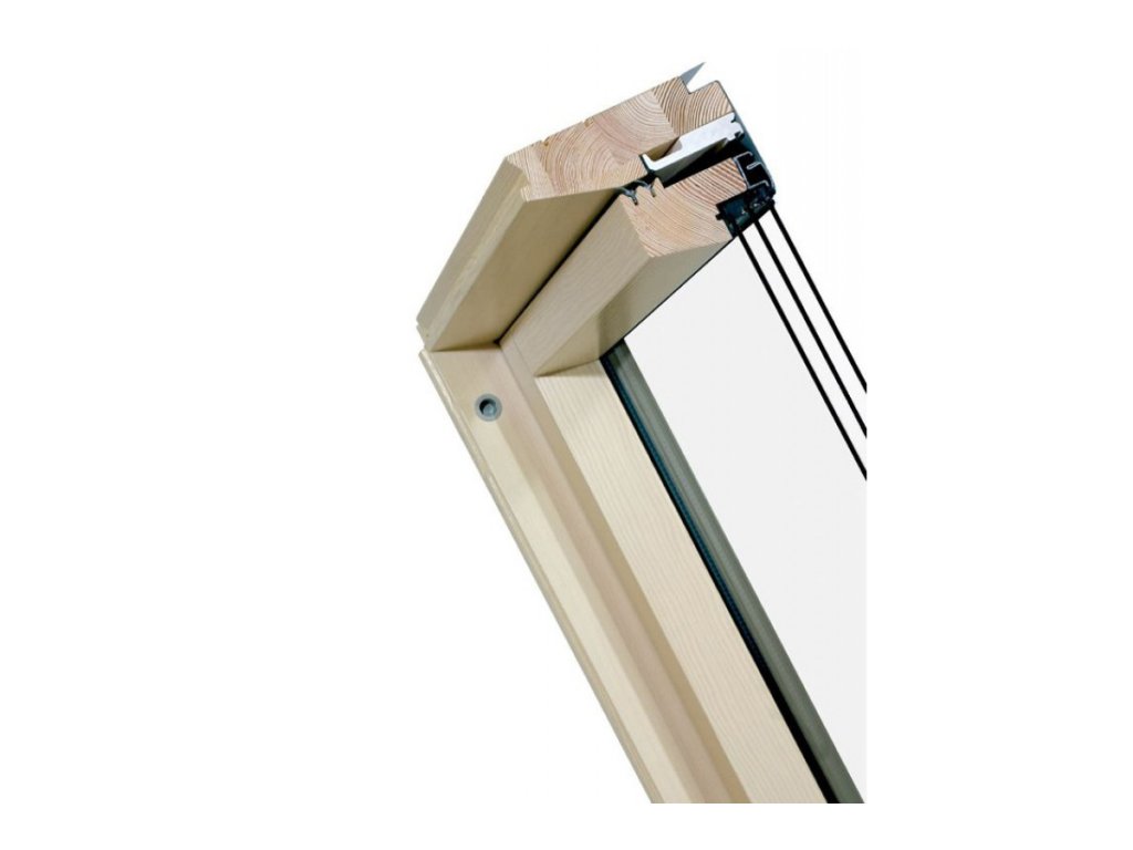 krídla, ktorý je konštruovaný zo širších drevených profilov v porovnaní so štandardným oknom a vybavený štvornásobným tesnením. Táto konštrukcia minimalizuje vznik tepelných mostov a zaisťuje celkovo lepšie izolačné vlastnosti okna. - Kyvné okná so závesmi umiestnenými nad polovicou výšky okna zaisťujú pohodlný prístup k otvorenému oknu aj vysokým osobám.
