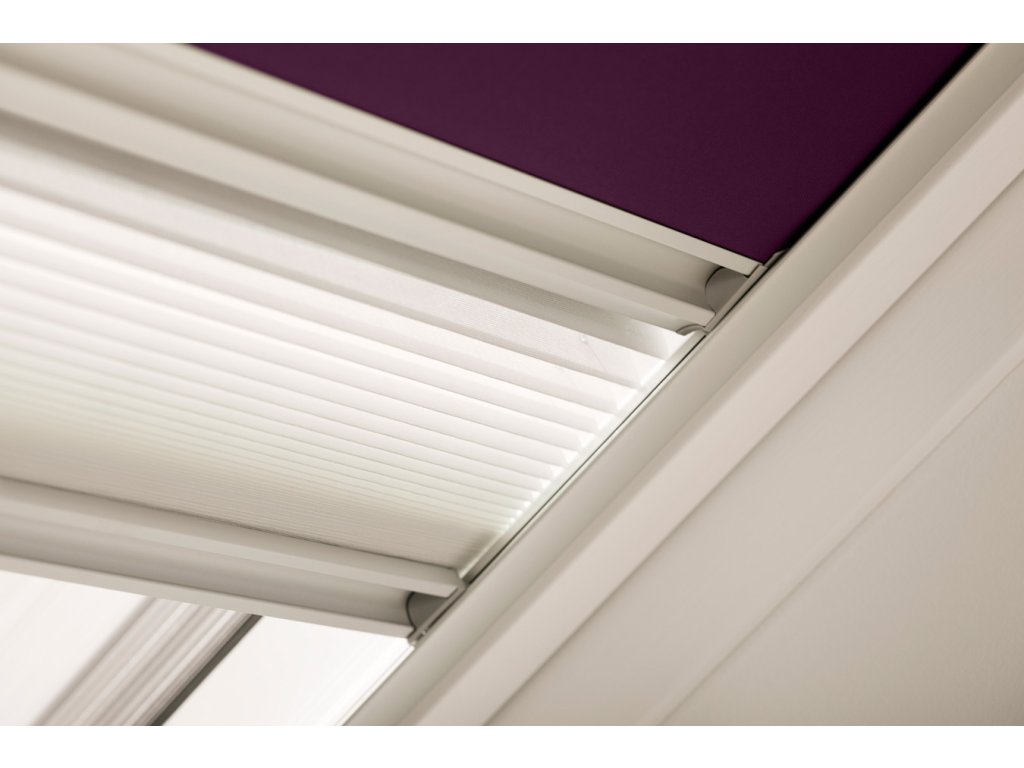 Vyberte si jedno z desiatich atraktívnych farebných vyhotovení plne zatemňujúcej rolety Velux DKL s kombináciou s bielou plisovanou roletou. Strieborná hliníková vrstva na zadnej strane plne zatemňujúcej rolety bráni prieniku svetla do miestnosti aj tepelným stratám v zimnom období.