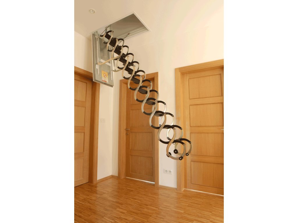 Podkrovné sťahovacie schody s plechovým sendvičovým poklopom pre zabudovanie do stropu. Vnútri poklopu je tepelná izolácia. Otvárací systém poklopu je od rozmeru d >= 1000 mm vybavený brzdiacim mechanizmom proti prudkému otvoreniu. Sendvičový poklop: drevený rám vyplnený izolačnými materiálmi je opláštený pozinkovaným plechom. Podhľadová časť poklopu podkrovných schodov je lakovaná v bielej farbe a krytá ochrannou fóliou.