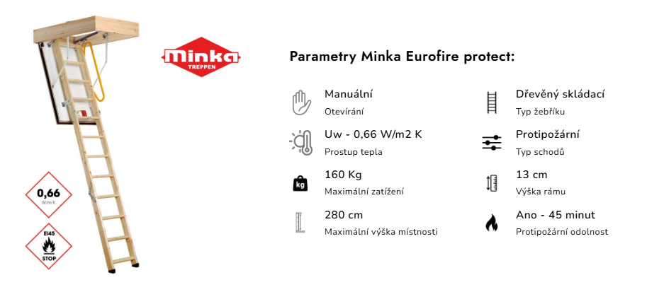 Protipožární a zateplené půdní schody Minka Eurofire Protect se skladácím dřevěným žebříkem a Uw víka =0,66 W/m2K.