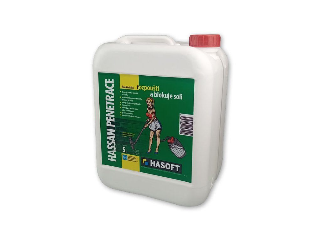 HASSAN PENETRACE je nízkoviskózní vodný roztok pro ošetření solí kontaminovaného zdiva. Proniká hluboko do podkladu, kde vodou rozpustné soli přeměňuje na ve vodě nerozpustné reakční produkty.