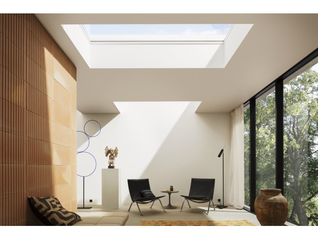 Neotevíravá základna světlíku nové generace Velux CFU. Designový světlík VELUX s plochým nebo zaobleným sklem a vnitřním dvojsklem má vynikající energetickou efektivitu i schopnost tlumit hluk deště, krupobití nebo dopravy