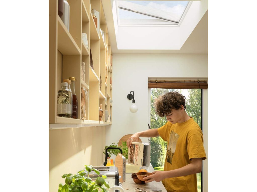 Dálkově ovládaná základna světlíku nové generace Velux CVU na elektrický pohon. Designový světlík...
