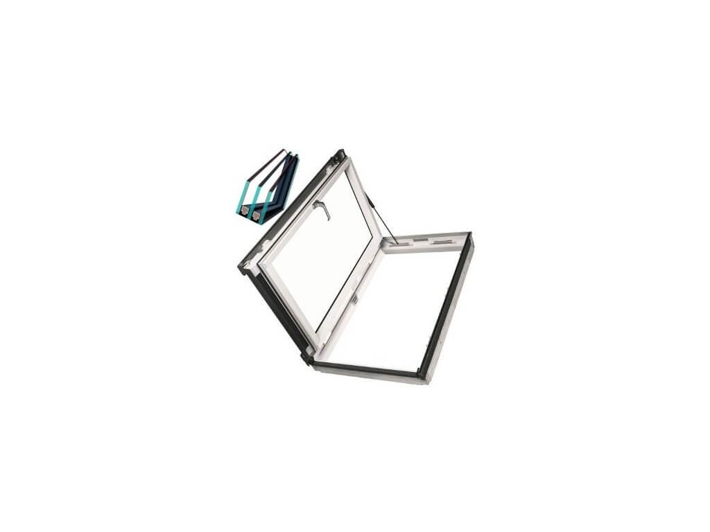 Výlezové okno s bílým polyuretanovým lakem. Super energeticky úsporné trojsklo.